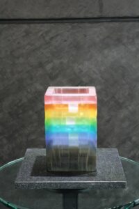 - l´une est taillée puis polie pour glorifier les couleurs de l´arc-en-ciel et pour exploiter les qualités du verre telles que la réfraction et la transmission de la lumière ;