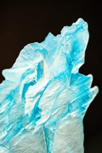Cette nouvelle pièce représente en quelque sorte un retour aux sources. Dans les années 70, alors que j’étais élève de Keith Cummings à l’Ecole d’art de Stourbridge, ma toute première pièce en verre coulé fut composée de couches de verre à vitres avec de la couleur intercalée, soumises au fusing puis au meulage et au polissage L’émerveillement suscité par cette découverte me poussa à me concentrer sur les possibilités extraordinaires du verre coulé, voyage qui dure encore jusqu’à aujourd’hui. Au fil du temps, j’ai eu différentes relations avec la couleur dans mon œuvre. Mes pièces des années 80 et du début des années 90 se caractérisent par une couleur vive éclatante. Depuis lors, j’ai été plus modéré, me bornant à une palette plus réduite et appréciant la pureté du cristal optique incolore. Ces dernières années, j’ai pensé utiliser davantage la couleur et j’ai eu la chance de recevoir un financement de l’Arts Council en Angleterre pour diriger un projet de recherche sur la couleur dans le verre coulé. Le point culminant en fut la participation à un atelier à North Lands Creative Glass avec le grand maître de la couleur Udo Zembok. J’expose ici, pour la première fois, ma nouvelle œuvre, née de cette expérience. Je voudrais remercier Udo Zembok de m’avoir inspiré par son enseignement et Serge Lechaczynski d’avoir choisi, pour les Verriales cette année, le thème parfait pour moi.