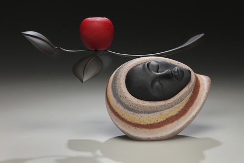 Ma sculpture cette année est une utilisation délibérée de symboles et métaphores mixtes. J’ai voulu mettre ensemble la pomme, symbole classique et chrétien de l’Homme tombé en disgrâce, et une icône de la culture islamique d’aujourd’hui. Bien que le buste de Néfertiti soit antérieur à l’Islam, il est resté pendant des millénaires dans les sables d’une région qui est de nos jours essentiellement