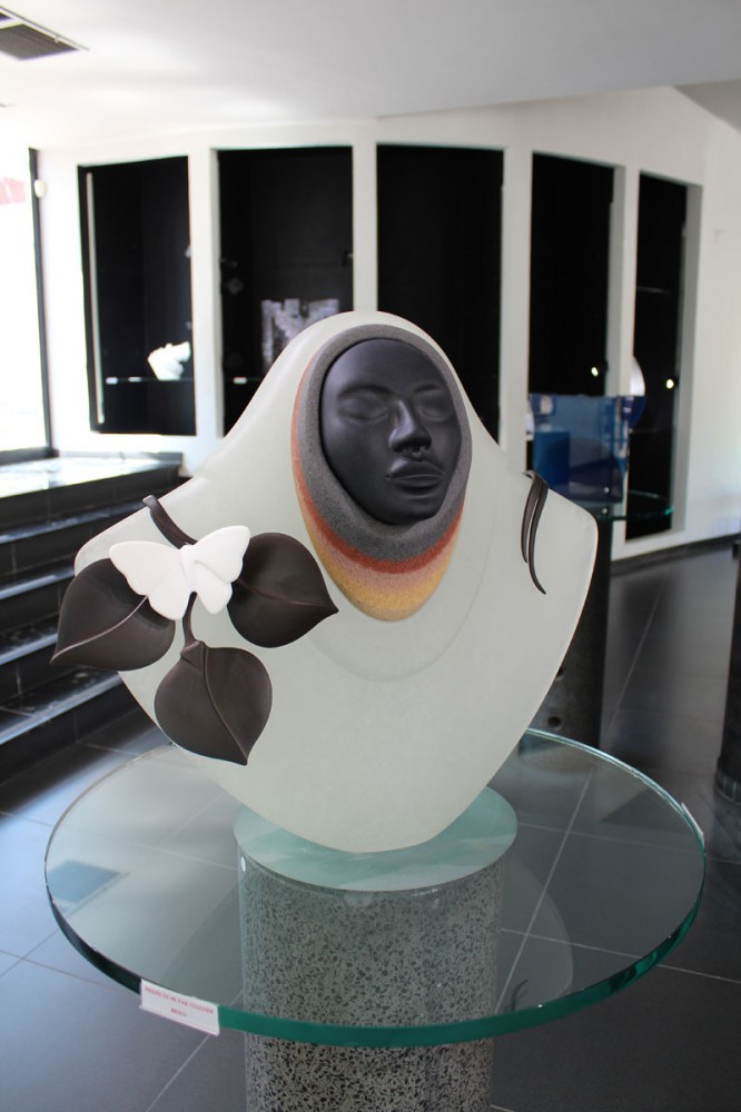 Je ne suis pas très “coloriste” dans mon œuvre sculpturale : j’ai tendance à concentrer mon attention sur la forme et la texture et je suis attirée par les mélanges des couleurs terre. Je suis surtout intéressée par la façon dont deux matériaux (ou plus), très différents, peuvent être employés pour se compléter et, ensemble, œuvrer parfaitement à la création d’un tout exceptionnel. Le thème des Verriales de cette année m’a donc poussée à prendre en compte un élément – habituellement quelque peu secondaire pour moi – et me demander ce que la couleur, en elle-même, apporte à une œuvre sculpturale.J’ai vu de nombreuses œuvres où la couleur était employée maladroitement, désastreusement même. Au fil des ans, j’ai également vu quantité d’œuvres où les couleurs étaient inappropriées ou déplacées, souvent même inutiles. Mais j’ai aussi vu bon nombre d’œuvres en deux ou trois dimensions, où la couleur faisait littéralement parler la pièce et où le choix des couleurs aidait aussi à définir les qui, quoi, quand, où et pourquoi de la pièce. Il y aurait tant à dire sur l’emploi de la couleur qu’essayer de le faire sur une seule page est tout simplement impossible. Disons juste que la couleur, utilisée à bon escient, peut être l’aspect de l’œuvre le plus descriptif. J’ai employé la notion de « couleur en tant que critère de description » dans mon approche pour l’exposition Polychrome de cette année.L’an dernier, j’ai modelé le visage d’une femme en argile et j’ai fait plusieurs moulages de ce visage en verre blanc, noir et transparent. J’étais constamment attirée par les plus sombres et j’ai fini par aboutir à deux moulages de «corps», plus grands, suggérant par leurs formes une femme drapée d’un long vêtement et d’une capuche la protégeant du vent ; l’une de ces sculptures fut présentée aux Verriales 2009. Ces personnages n’ont aucune ethnicité clairement définie, bien qu’ils en suggèrent plusieurs : inuit, africaine, mexicaine, tibétaine et d’Amérique centrale.Cette année, j’ai réalisé une composition avec l’une des plus grandes pièces, en y introduisant la couleur en tant qu’élément d’identification des origines géographiques de cette femme. Puisant mon inspiration dans les couleurs et les motifs éclatants des tenues traditionnelles féminines des régions subsahariennes, je pense que cette sculpture représente, de toute évidence, une femme en tenue africaine. Je suis véritablement en admiration devant les talents artistiques exprimés dans les tissus et les vêtements des vraies Africaines ; cette sculpture est donc ma modeste façon de rendre hommage à ces peuples qui utilisent la couleur avec autant d’exubérance que de maîtrise. Pour eux, la couleur est totalement intégrée et essentielle à la vie quotidienne. Cela m’a vraiment donné matière à réflexion pour mes futures œuvres.