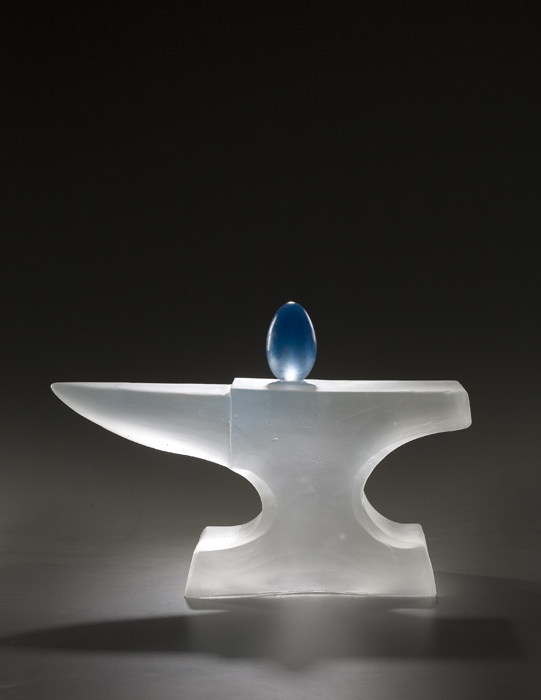 Le contraste est aussi défini comme des forces en opposition, ce qui nous a conduit à produire la pièce l´Enclume et l´Oeuf. Cette rencontre, potentiellement dangereuse, de ces deux objets nous est apparue encore plus intéressante lorsque, en équilibre sur l´Enclume légère, l´Oeuf donne une impression de grande lourdeur.