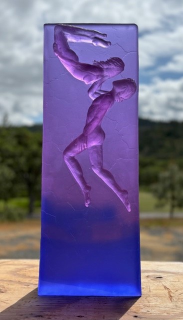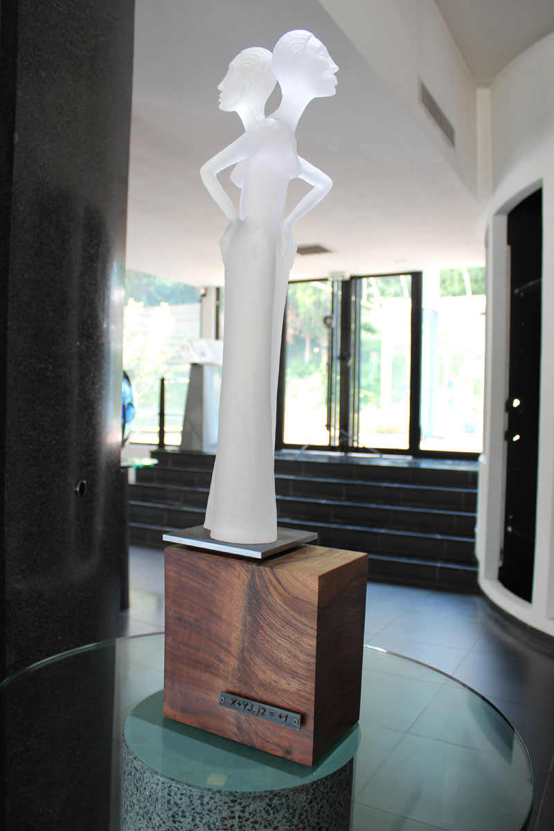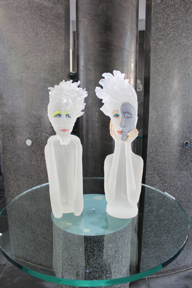 Une fois encore, Serge nous a lancé un défi par le choix de son thème, un thème à nous faire perdre la raison. Que veut-il dire par « polychromie » ? En quoi la multiplicité de couleurs dans le verre est-elle particulièrement intéressante ? Nous l’utilisons tout le temps ! Aussi, nous avons recherché une signification plus profonde ou bien une définition plus compliquée. Puis, alors que nous étions sur le point d’abandonner, nous sommes tombés sur la Polychromie Le Corbusier.C’est ainsi que le mouvement puriste, créé par Le Corbusier et Amédée Ozenfant en 1918, fut la source de notre inspiration. La particularité des œuvres puristes est l’utilisation caractéristique de formes géométriques, de grandes zones de couleur pure et de surfaces peintes fraîches et détachées.Nous avons décidé d’exposer des figures aux formes primaires où :- la verticalité domine- les éléments horizontaux servent de support- les courbes expriment subtilité, continuité et féminité.C’est avec une bonne dose d’humour que nous vous présentons ces idées.« Chaque sujet semble simple et clair jusqu’à ce nous l’examinions un peu » Eugenio d’Ors