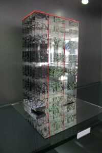 clairement devant nous. Les objets se construisent à partir de lignes emmêlées, imprégnant le verre pour être multipliées par les reflets d‘un miroir. Ils ont des formes variées – avenues d’arbres, viaduc dans un paysage, abîmes vers des profondeurs infinies, figures humaines floues, aperçu de sphères fragmentées –, images symboliques de la pomme du pêché originel d‘Eve. Il suffit d’approcher de quelques pas,