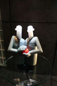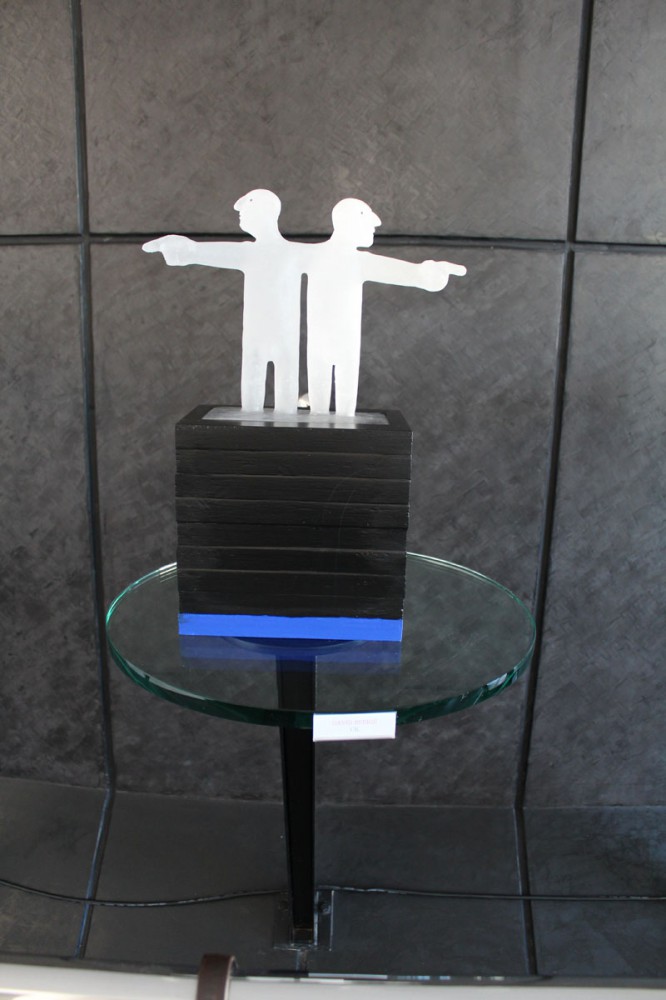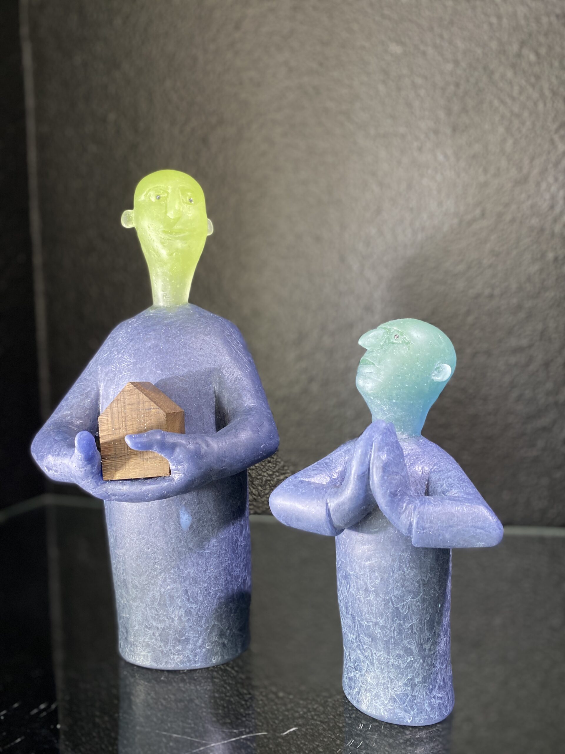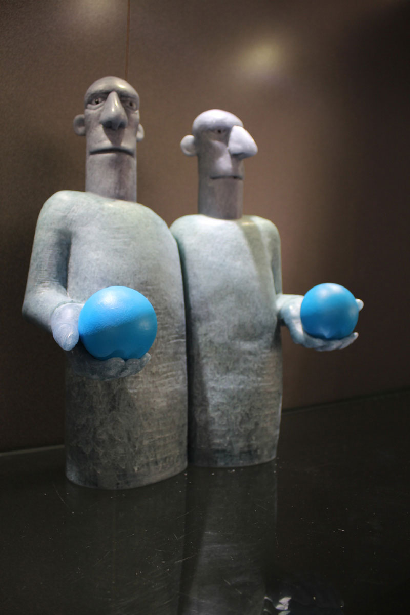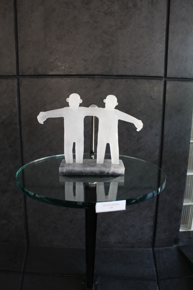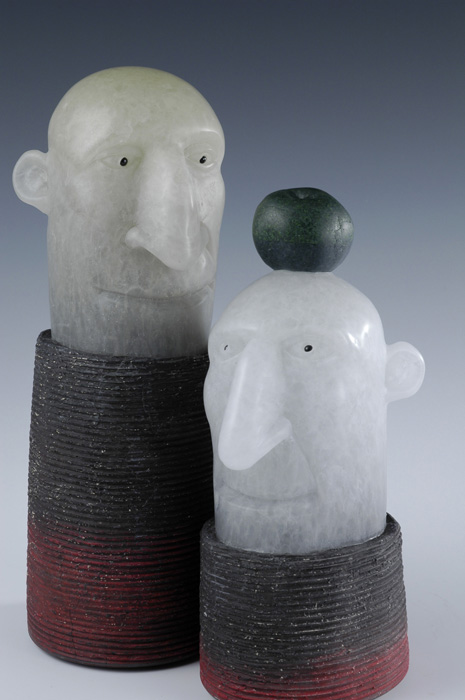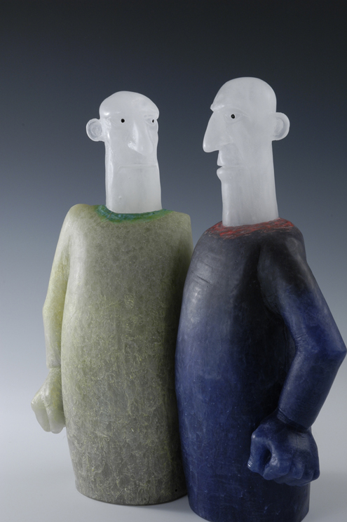 La couleur représente une composante très importante de mon travail car elle aide à définir l’ambiance ou le discours de mes créations ; elle s’intègre tôt, dès les premiers dessins, au stade de l’examen et du développement de nouvelles idées. L’emploi de la couleur est ensuite affiné, puis je tranche, après étude des couleurs, en fonction des différentes alternatives et combinaisons possibles. J’ai développé la technique de coloration du verre depuis de nombreuses années. J’utilise des pigments finement moulus, conçus pour être utilisés sur des céramiques mais qui ont le même point de fusion que le verre, au moment du coulage. Ces couleurs sont soit appliquées sur la surface du moule, soit mélangées au verre avant le coulage. Lorsque la fusion se fait dans le four, elles s’unissent et fusionnent avec la pièce de verre. Avec cette technique, je peux mélanger les couleurs comme de la peinture ; le verre acquiert alors les qualités et les effets des dessins originaux. Ces nouvelles œuvres, dans la continuité de mes études sur les relations, témoignent de cette approche. Un dialogue est une conversation entre deux – ou plus – personnes, une discussion orientée vers le développement d’un sujet ou la résolution d’un problème. Ici, le spectateur est livré à lui-même pour interpréter les subtilités des relations.