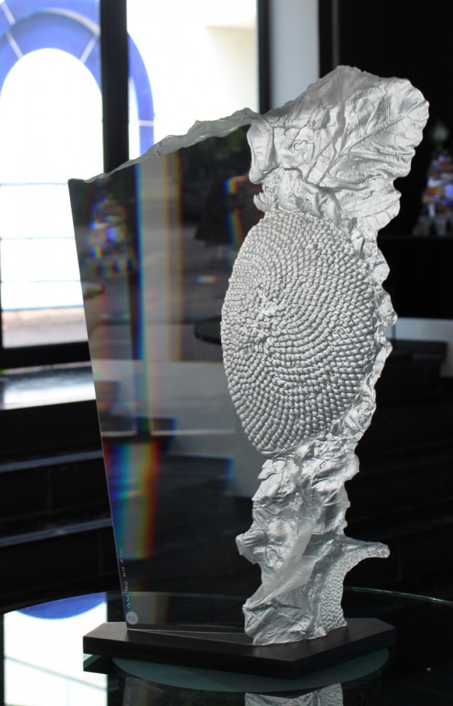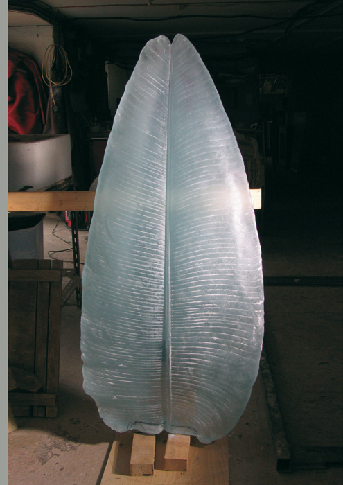 J´ai exprimé la Vie en moulant la forme d´une grande feuille. Je tiens à remercier les responsables du projet Eden (Cornouailles, Angleterre) qui m´ont généreusement permis l´accès au fabuleux Biotope Tropical où j´ai trouvé la source d’inspiration de cette pièce.