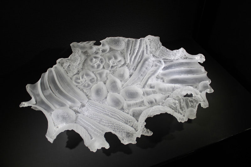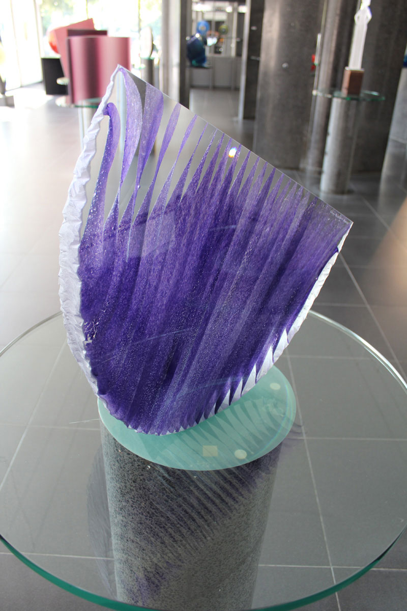 Cette nouvelle pièce représente en quelque sorte un retour aux sources. Dans les années 70, alors que j’étais élève de Keith Cummings à l’Ecole d’art de Stourbridge, ma toute première pièce en verre coulé fut composée de couches de verre à vitres avec de la couleur intercalée, soumises au fusing puis au meulage et au polissage L’émerveillement suscité par cette découverte me poussa à me concentrer sur les possibilités extraordinaires du verre coulé, voyage qui dure encore jusqu’à aujourd’hui. Au fil du temps, j’ai eu différentes relations avec la couleur dans mon œuvre. Mes pièces des années 80 et du début des années 90 se caractérisent par une couleur vive éclatante. Depuis lors, j’ai été plus modéré, me bornant à une palette plus réduite et appréciant la pureté du cristal optique incolore. Ces dernières années, j’ai pensé utiliser davantage la couleur et j’ai eu la chance de recevoir un financement de l’Arts Council en Angleterre pour diriger un projet de recherche sur la couleur dans le verre coulé. Le point culminant en fut la participation à un atelier à North Lands Creative Glass avec le grand maître de la couleur Udo Zembok. J’expose ici, pour la première fois, ma nouvelle œuvre, née de cette expérience. Je voudrais remercier Udo Zembok de m’avoir inspiré par son enseignement et Serge Lechaczynski d’avoir choisi, pour les Verriales cette année, le thème parfait pour moi.