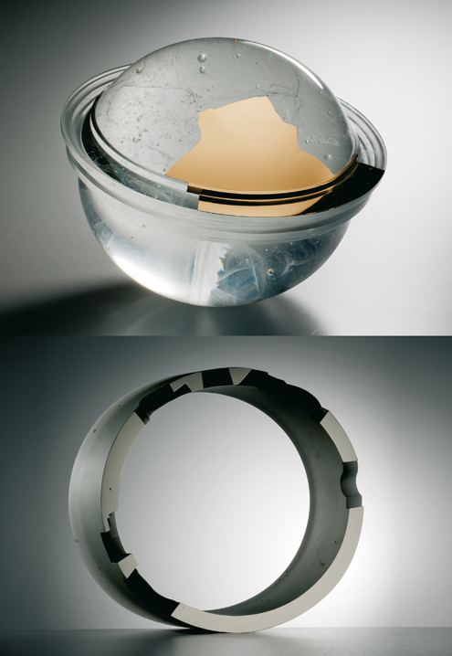 La polychromie du verre est une technique venue du XIXème siècle. Ne connaissant aucun de mes collègues utilisant ce procédé, je me suis captivé pour ce thème. Comment interpréter ce vieux procédé dans le monde actuel ? J’ai décidé d’utiliser des métaux d’or et de platine étendus sur la surface du verre, selon une composition longuement réfléchie. L’objet sphérique avec sa corniche, évoque l’époque du baroque. L’anneau est un contraste de surfaces taillées, polies et platinées. Le travail sur ce thème fut source d’idées intéressantes et de grands plaisirs.