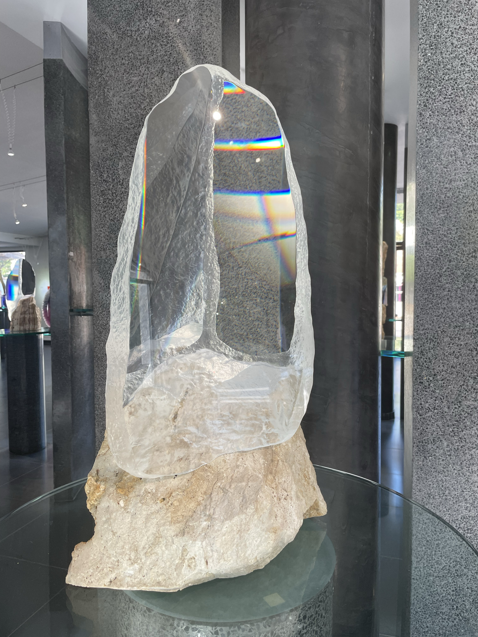 Optical clear glass; shaped, sculpted, softened and part polished, specular device, light. 2006