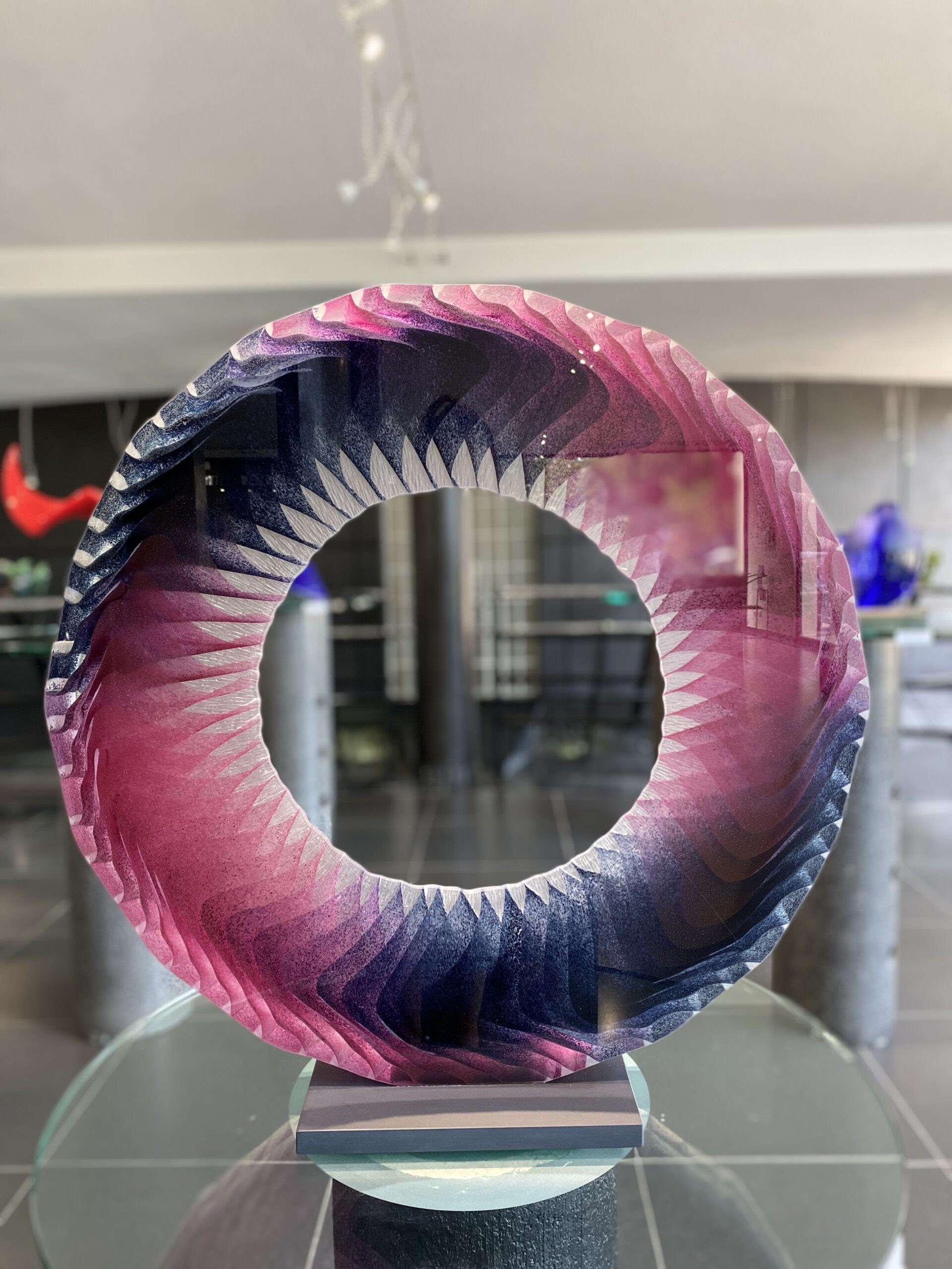 Cette nouvelle pièce représente en quelque sorte un retour aux sources. Dans les années 70, alors que j’étais élève de Keith Cummings à l’Ecole d’art de Stourbridge, ma toute première pièce en verre coulé fut composée de couches de verre à vitres avec de la couleur intercalée, soumises au fusing puis au meulage et au polissage L’émerveillement suscité par cette découverte me poussa à me concentrer sur les possibilités extraordinaires du verre coulé, voyage qui dure encore jusqu’à aujourd’hui. Au fil du temps, j’ai eu différentes relations avec la couleur dans mon œuvre. Mes pièces des années 80 et du début des années 90 se caractérisent par une couleur vive éclatante. Depuis lors, j’ai été plus modéré, me bornant à une palette plus réduite et appréciant la pureté du cristal optique incolore. Ces dernières années, j’ai pensé utiliser davantage la couleur et j’ai eu la chance de recevoir un financement de l’Arts Council en Angleterre pour diriger un projet de recherche sur la couleur dans le verre coulé. Le point culminant en fut la participation à un atelier à North Lands Creative Glass avec le grand maître de la couleur Udo Zembok. J’expose ici, pour la première fois, ma nouvelle œuvre, née de cette expérience. Je voudrais remercier Udo Zembok de m’avoir inspiré par son enseignement et Serge Lechaczynski d’avoir choisi, pour les Verriales cette année, le thème parfait pour moi.