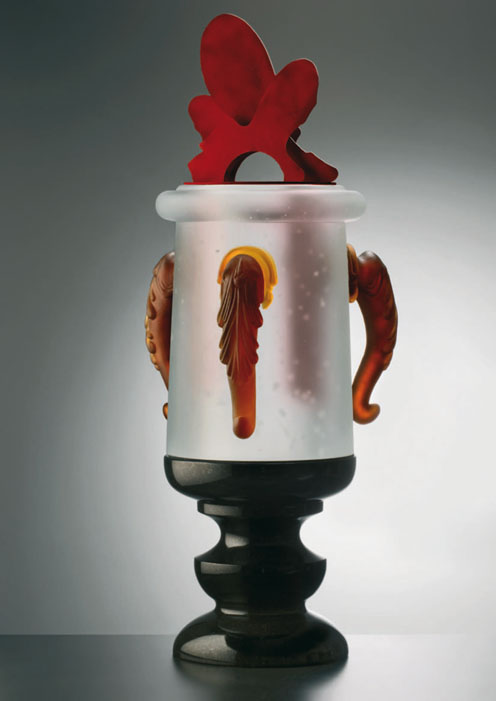 Les coupes, en tant que trophées, sont des récompenses aux vainqueurs.Elles reflètent la singularité du moment unique où, malgré toutes les épreuves antérieures, un homme est enivré par la joyeuse légèreté de l’esprit. Mais, comme cet instant est éphémère dans la marche du monde !Il semblerait que Bohumil Eliáš fils ait représenté quelque chose de sacré et d’intangible, comme une précieuse relique emplie d’un sentiment de gloire. Son objet mystique aux formes bizarres allie la noblesse solennelle d’une pierre placée sur un piedouche au mystère voilé du contenu d’un récipient en verre. Néanmoins, le tout est couronné de manière grotesque par la représentation abstraite d’une sorte de scène supposée « héroïque ». S’agit-il d’une coupe en souvenir éternel de grands actes et en même temps d’un soupir légèrement ironique sur la vanité de la gloire terrestre ?