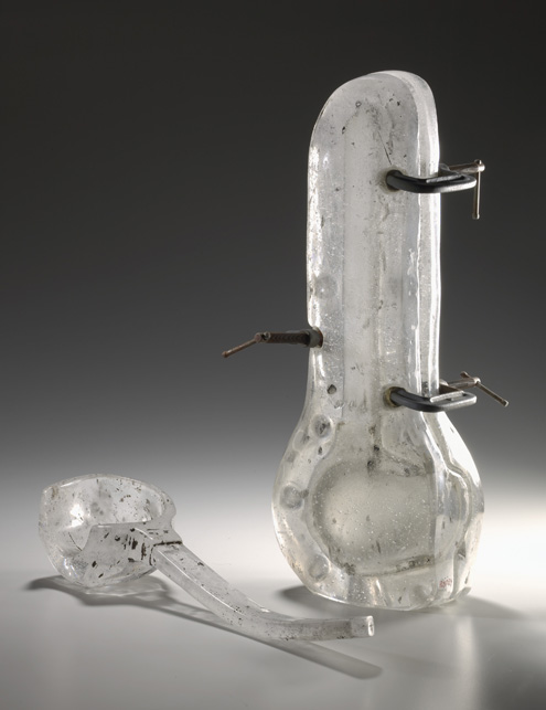 Les deux pièces présentées dans cette exposition sont nées de la forme de la mailloche, outil employé par le souffleur de verre pour stopper le verre fondu aux toutes premières étapes de soufflage d’une bulle.